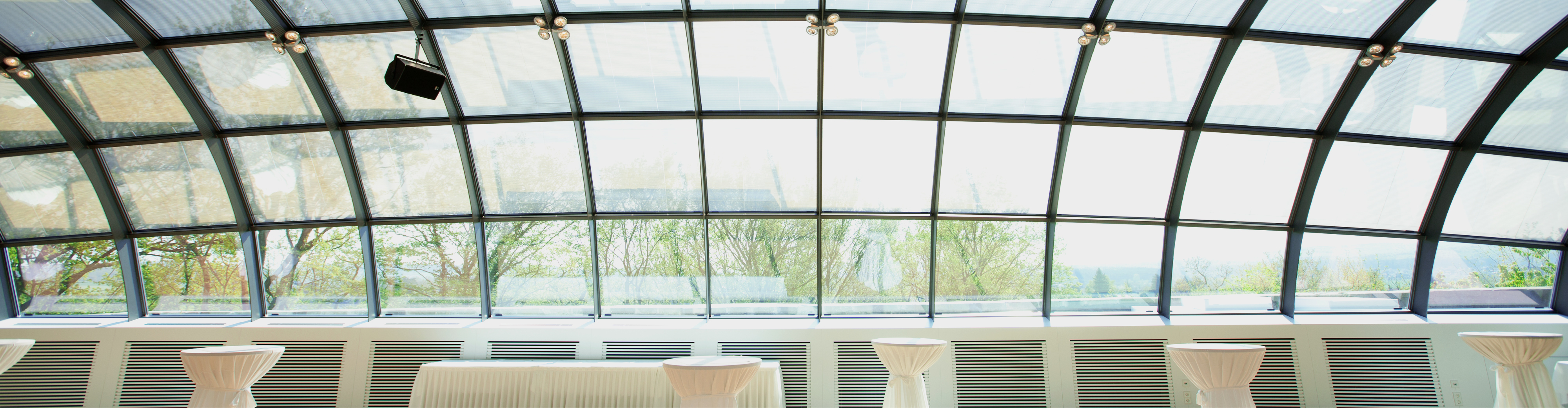 Terrasse mit herrlichem Blick über Montabaur und den Westerwald schaffen optimale Veranstaltungsbedingungen auf beiden Ebenen des Veranstaltungszentrums: Raum 900 auf der unteren Ebene kann mit mobilen Zwischenwänden in drei Veranstaltungsräume (120, 103 und 102 m2) unterteilt werden. Auf der oberen Ebene, direkt unter der Glaskuppel befindet sich ein weiterer, ebenfalls teilbarer Raum mit "Wow-Effekt". Beide Ebenen bieten direkten Zugang nach draußen und und können individuell je nach Anlass bestuhlt werden.