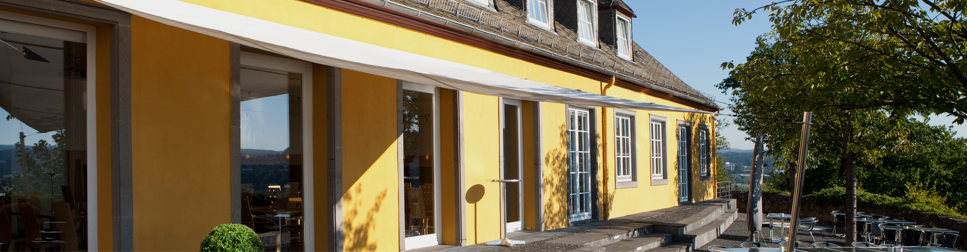 Directly adjacent to the Weitblick buffet restaurant, you will find the winter garden of the Haus Humbach building. The newly renovated events room for business and private events features state-of-the-art technology and cutting-edge media equipment such as a hybrid system, a sound system and an 87-inch screen. The winter garden is ventilated, shaded ad also enjoys direct access to the castle terrace.